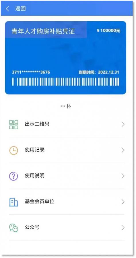 6.憑證發(fā)放。公示完成后,青年人才自動(dòng)獲取“青年人才購房補(bǔ)貼憑證”,并可在該頁面查看憑證基本信息、使用記錄、使用說明、基金會(huì)員單位等。