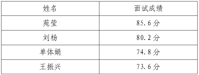 受日照市文化旅游集團(tuán)有限公司委托,日照人才發(fā)展集團(tuán)于2022年3月23日在日照人才發(fā)展集團(tuán)網(wǎng)站和日照人才集團(tuán)微信公眾平臺面向社會公開發(fā)布《國博中心大酒店公開招聘職業(yè)經(jīng)理人簡章》。根據(jù)簡章要求,報(bào)名時(shí)間從自2022年3月23日起至3月28日下午16:00截止。本次共有8人報(bào)名,經(jīng)過資格審查,最終4人符合報(bào)名條件,進(jìn)入面試環(huán)節(jié)。面試于2022年3月30日上午在日照人才發(fā)展集團(tuán)舉行,面試采用應(yīng)聘人員自我介紹+面試官提問方式進(jìn)行,面試成績?yōu)?位面試官評分的平均值?,F(xiàn)將面試成績公示如下,公示期為5個(gè)工作日(2022年3月31日-2022年4月7日)。公示期內(nèi)如有異議,可及時(shí)反映,聯(lián)系電話:0633-8866279。