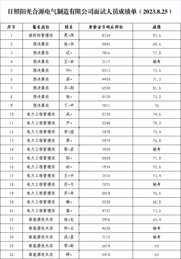 日照陽(yáng)光合源電氣制造有限公司公開(kāi)招聘勞務(wù)派人員面試成績(jī)公示